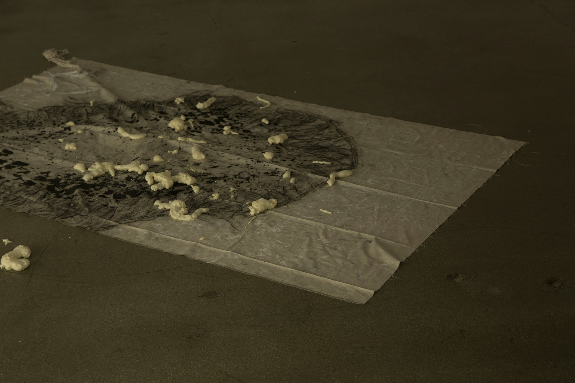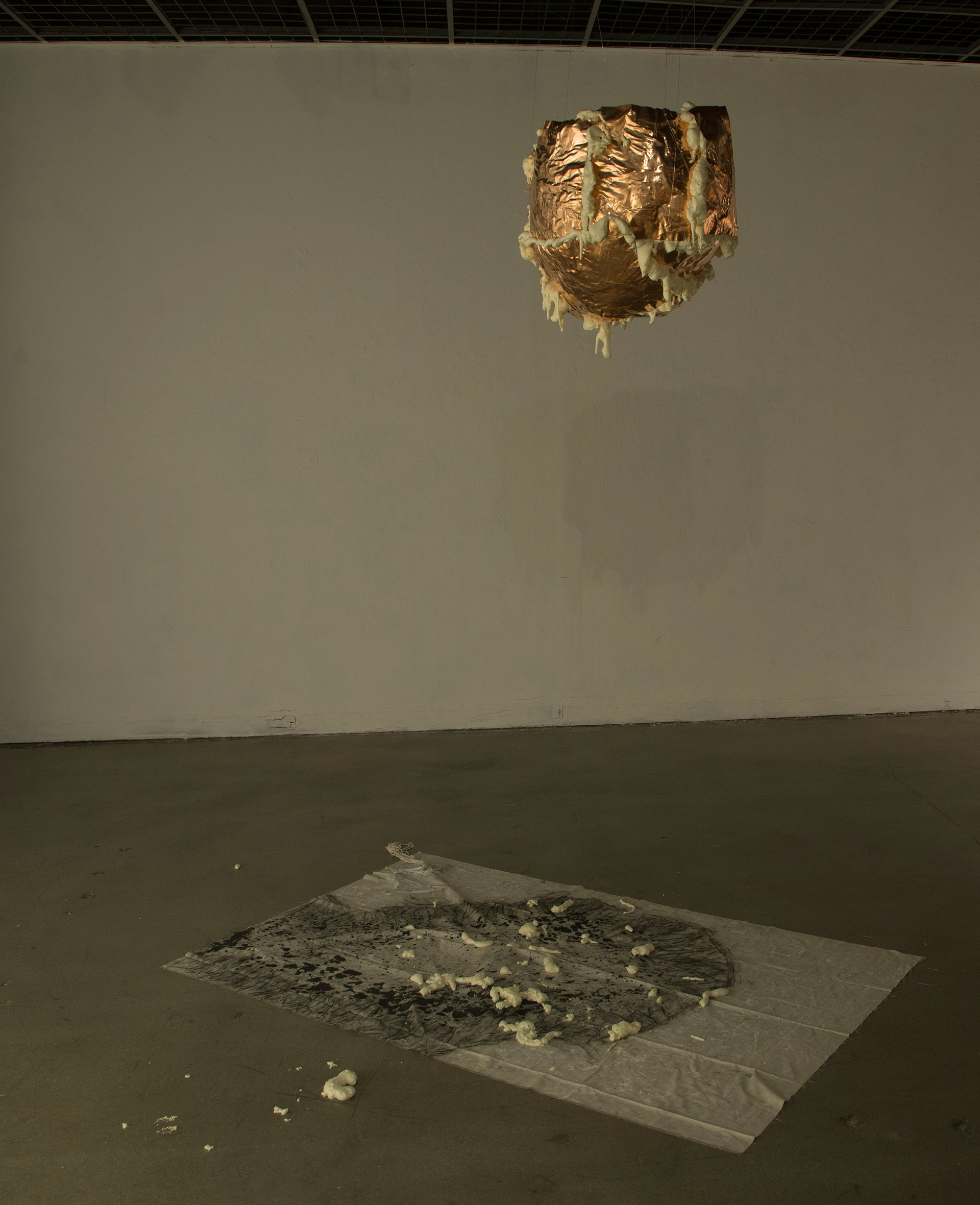 The show grew from the idea of the skin, reconsidered as a layer that separates or holds, which extended into the thoughts of the physical materiality of the body and the intangible aspects of the human mind. The installations use various materials and represent different thoughts about the human condition: the solidification of the extension outside of one’s skin, the shapes and patterns created by honest interactions of the human body to body/object/ nature, and the layer of a human body that has been peeled off, inside out. The materials include: inflatable human figure toys, form, canvas, charcoal, latex, plaster, cheese cloth, indian ink, lead, wax, copper, silicon, wig, bed, thread, bed sheet and stand light.